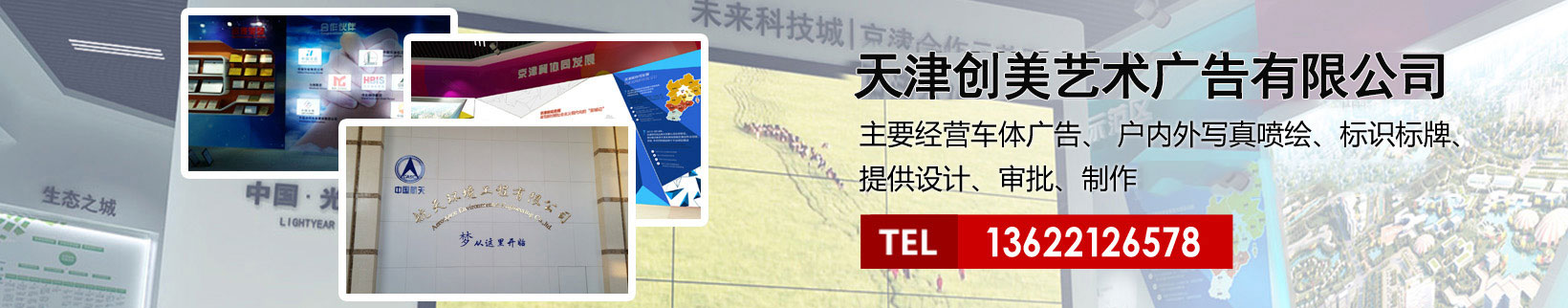 天津創美藝術廣告有限公司主要經營車體廣告、 戶內外寫真噴繪、標識標牌、提供設計、審批、制作、發(fā)布的服務。